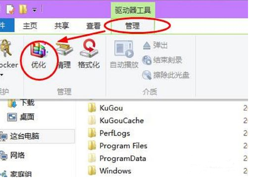 进入c盘后点击上方菜单栏中的管理——优化。