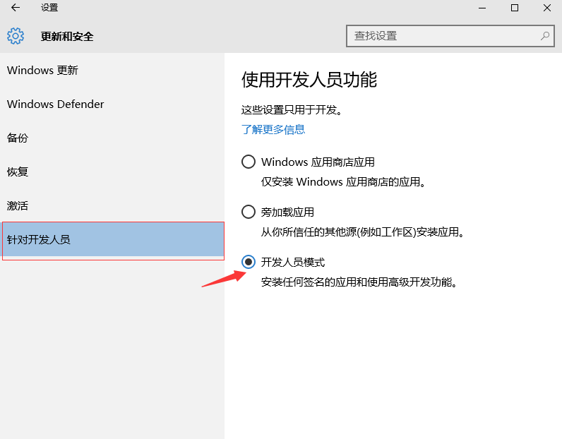第二步:进入界面选择”针对开发人员“,开启开发人员模式,如下图。