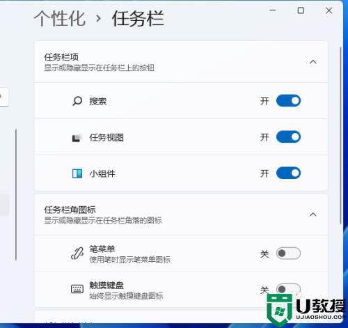 4、然后我们就能在右侧看到任务栏各种图标的开关了。