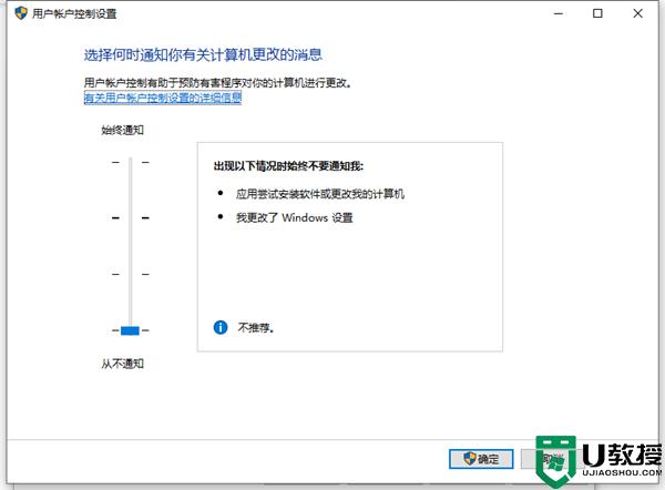 4、接着在打开的页面中,将滑块调到最下面。进行从不通知,点击确定,这样win10鼠标一直转圈假死的问题就解决了。